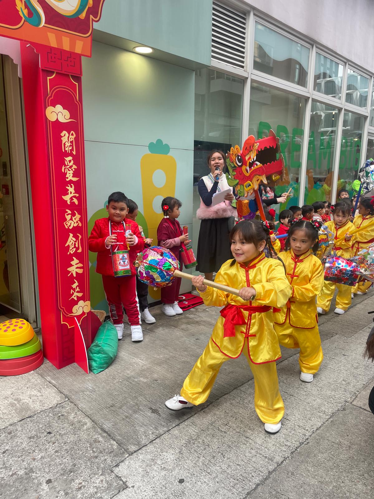 The K3 children led the children of each class to perform dragon dance outside the school. K3 children performed dragon and lion dances. N class and K1 class children were responsible for playing drums and cymbals for accompaniment. K2 children were responsible for singing to support the celebration. The scene was very lively.