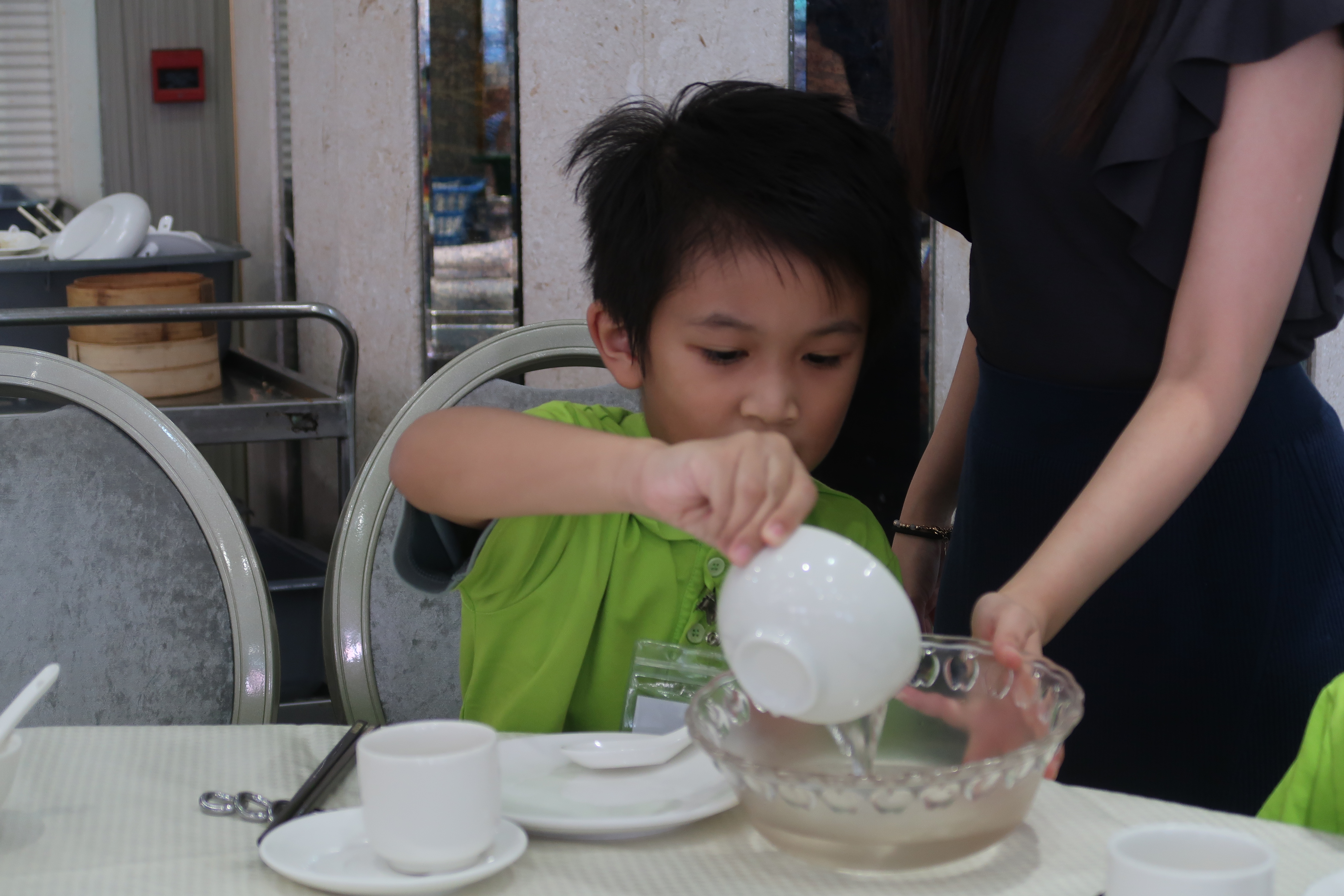 Through activities, children can taste Chinese food and get to know the appearance of a teahouse, use different Chinese tableware personally, and learn the etiquette of going to a teahouse. For example, when someone pours tea for you, you can say thank you or express your gratitude with gestures.